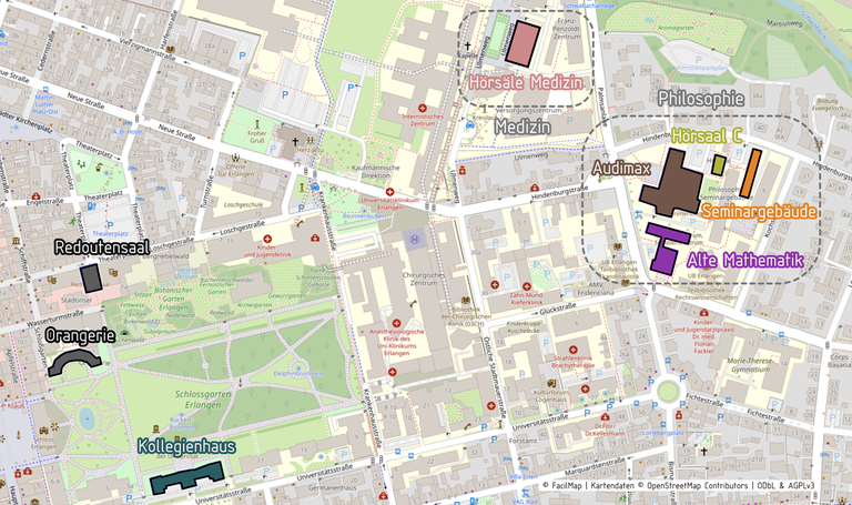 The main conference venues (housing most lecture halls) are around the Schlossgarten (Kollegienhaus) and around the AudiMax building.